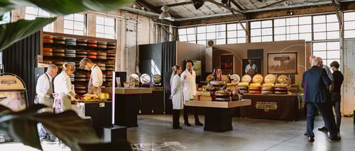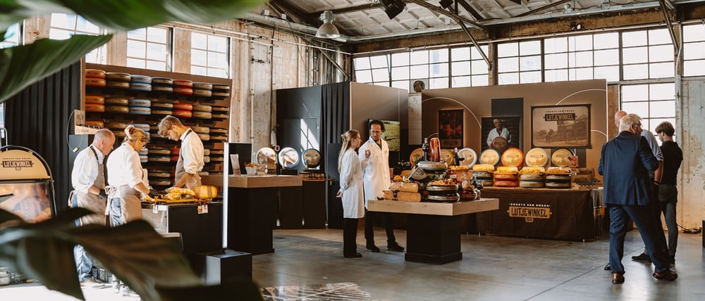 Every event starts with a good concept. So the Vanderloo team sat down with the Velder team for a brainstorming session. Henry: 'Cheese suppliers, decor builders, chefs, the hospitality team: it's important to make the concept clear to everyone, so that it is implemented properly in all areas. Of course cheese and a drink go hand in hand, but for this fair we wanted to give the craft around cheese a modern twist.' The theme became "Tastify: tasting, seeing and smelling cheese. After a route along sixty stands of cheese suppliers, the visitor arrives at the catering square with live cooking with cheese, cheese pairing with beer and wine, cheese tastings and especially a lot of conviviality. Henry: "Velder wanted to use the fair not only to inform people, but also to bring them together. The hospitality square was of course the ideal place to network in the middle of a world of cheese.'